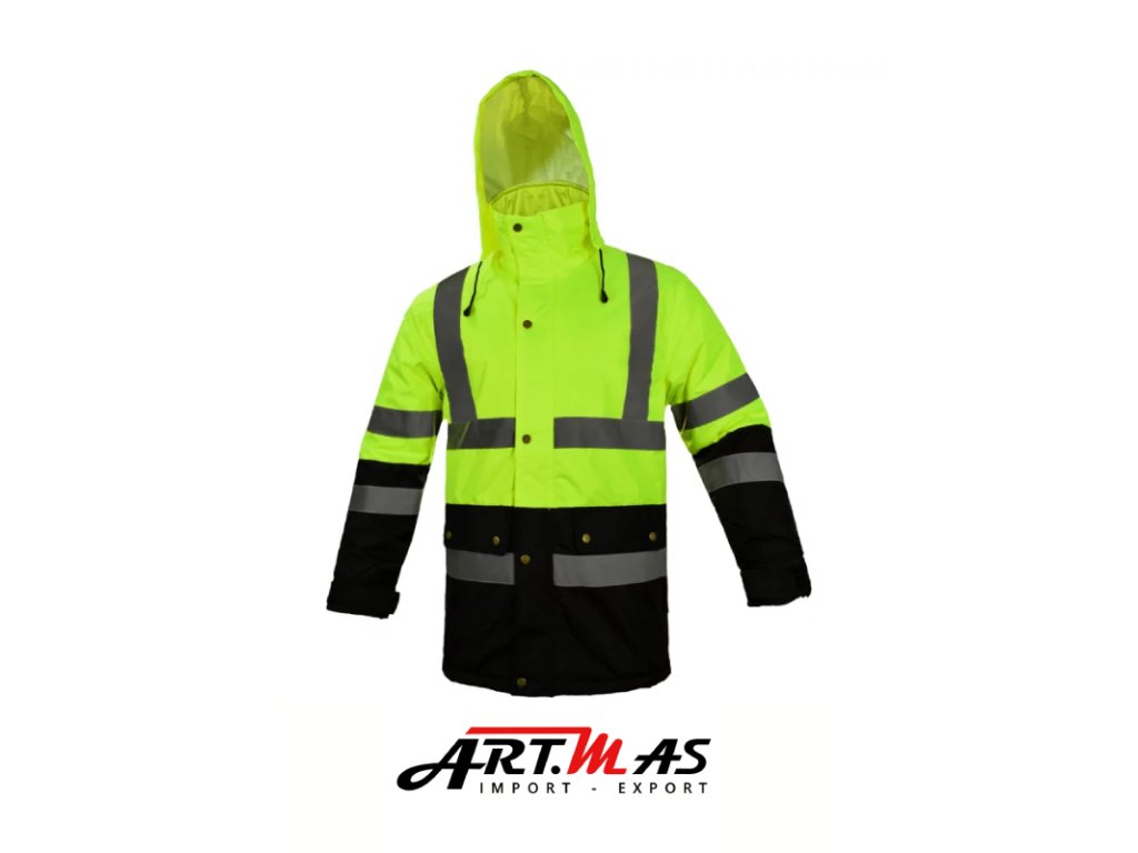 Zateplená ochranná bunda z vodeodolnej, fluorescenčnej 300D polyesterovej Oxford tkaniny s vysokou viditeľnosťou, PU impregnovaná, polyesterová izolácia, zvnútra zakončená polyesterovou prešívanou podšívkou.