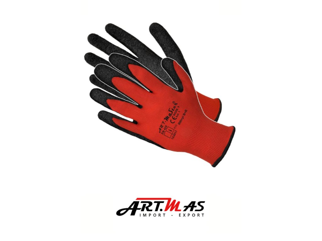 Pracovné rukavice, pletené z červeného polyesteru, potiahnuté čiernym latexom. Dodatočné hrubé