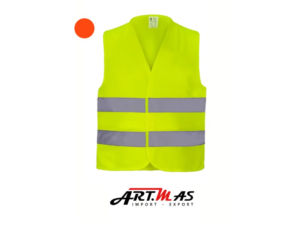 Výstražná vesta vyrobená z vysoko kvalitnej polyesterovej tkaniny vo žiarivej žltej s dvoma reflexnými pruhmi, na prednej strane pripevnená suchým zipsom.